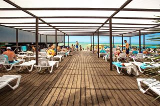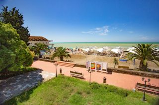 Расстояние от основных корпусов пансионата до пляжа - около 150 метров. Пляж у отеля песчано-галечный, ухоженный, оборудованный всем необходимым для комфортного отдыха.